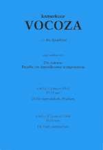 Hieronder vindt u de concerthistorie van Kamerkoor Vocoza sinds zijn oprichting in 1980. U vindt zowel concert-gegevens en publiciteitsmateriaal, als recensies van concerten. Deze historie is permanent 'onder constructie', zowel terug in de tijd, als naar de toekomst toe. Mocht u beschikken over archiefmateriaal dat van belang kan zijn voor Vocoza, dan nodigen we u graag uit ons dat te laten weten, bijvoorbeeld per email. Ook correcties op de hier gepresenteerde historie worden verwelkomd. Kamerkoor Vocoza |
